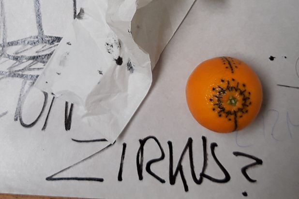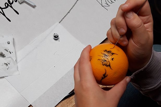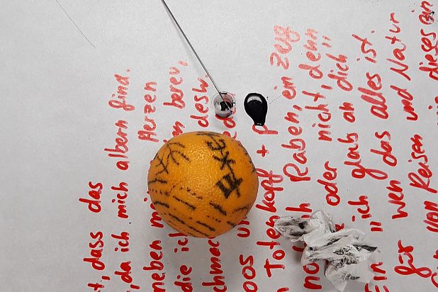 Im Anschluss führte die Gruppe in eine performative Auseinandersetzung mit der Orange: Es wurde getanzt, improvisiert, experimentiert – ein „Tango mit einer Orange". Zum Abschluss erhielten die Orangen Tätowierungen, Spuren, Zeichen – sichtbare Ergebnisse eines prozesshaften künstlerischen Forschens.